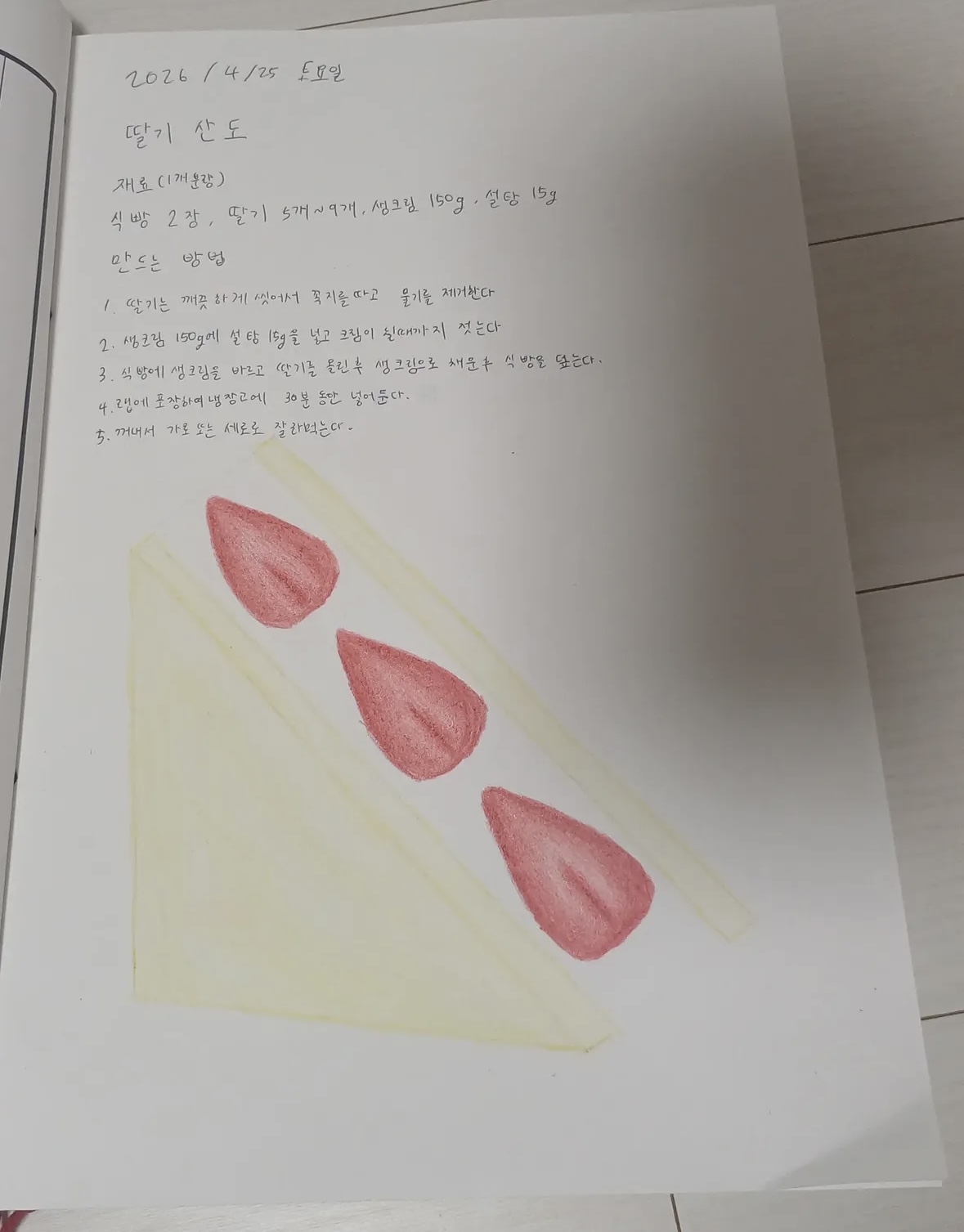 첫날은 자기소개와 동아리소개를 하고 귀염뽀짝 앞치마를 하고 간단한 디저트로 딸기산도를 만들었습니다. 야무지게 레시피북도 정리한 우리 친구들 참 멋집니다!