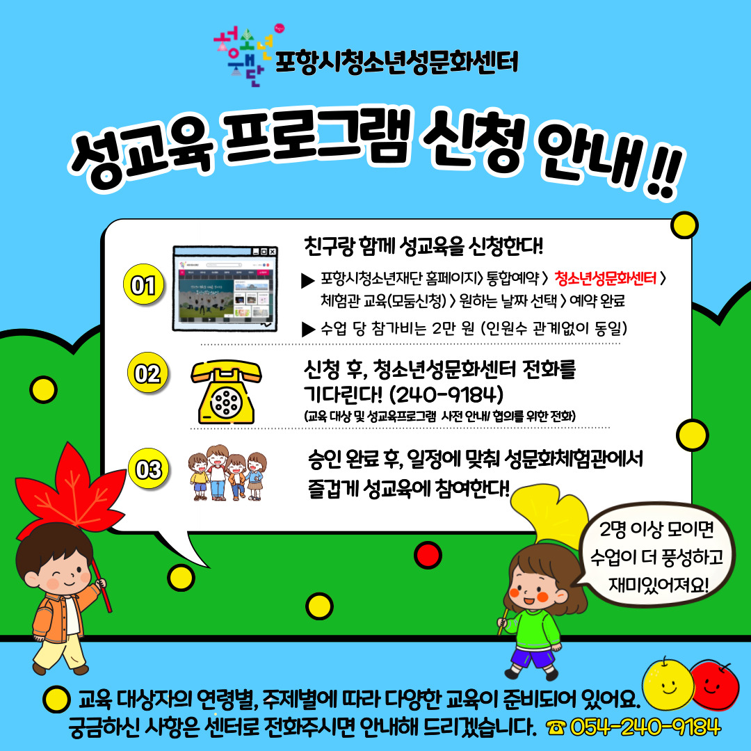 궁금하신 사항은 성문화센터로 전화 (☎054-240-9184)주시면 친절하게 안내해드리겠습니다^^