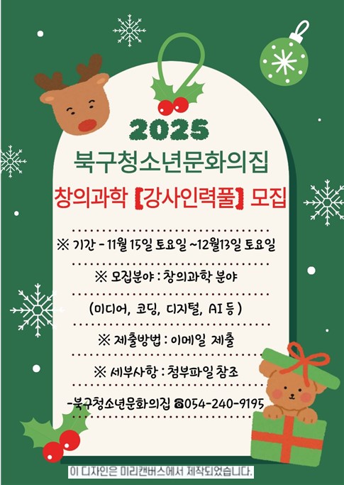 2025년 포항시북구청소년문화의집(꿈트리센터) 창의과학 [강사 인력풀] 모집 공고