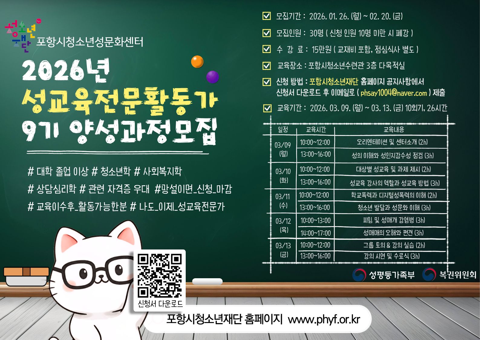■ 신청 방법 :포항시청소년재단 홈페이지 공지사항에서 신청서 다운로드 후 이메일(phsay1004@naver.com) 접수