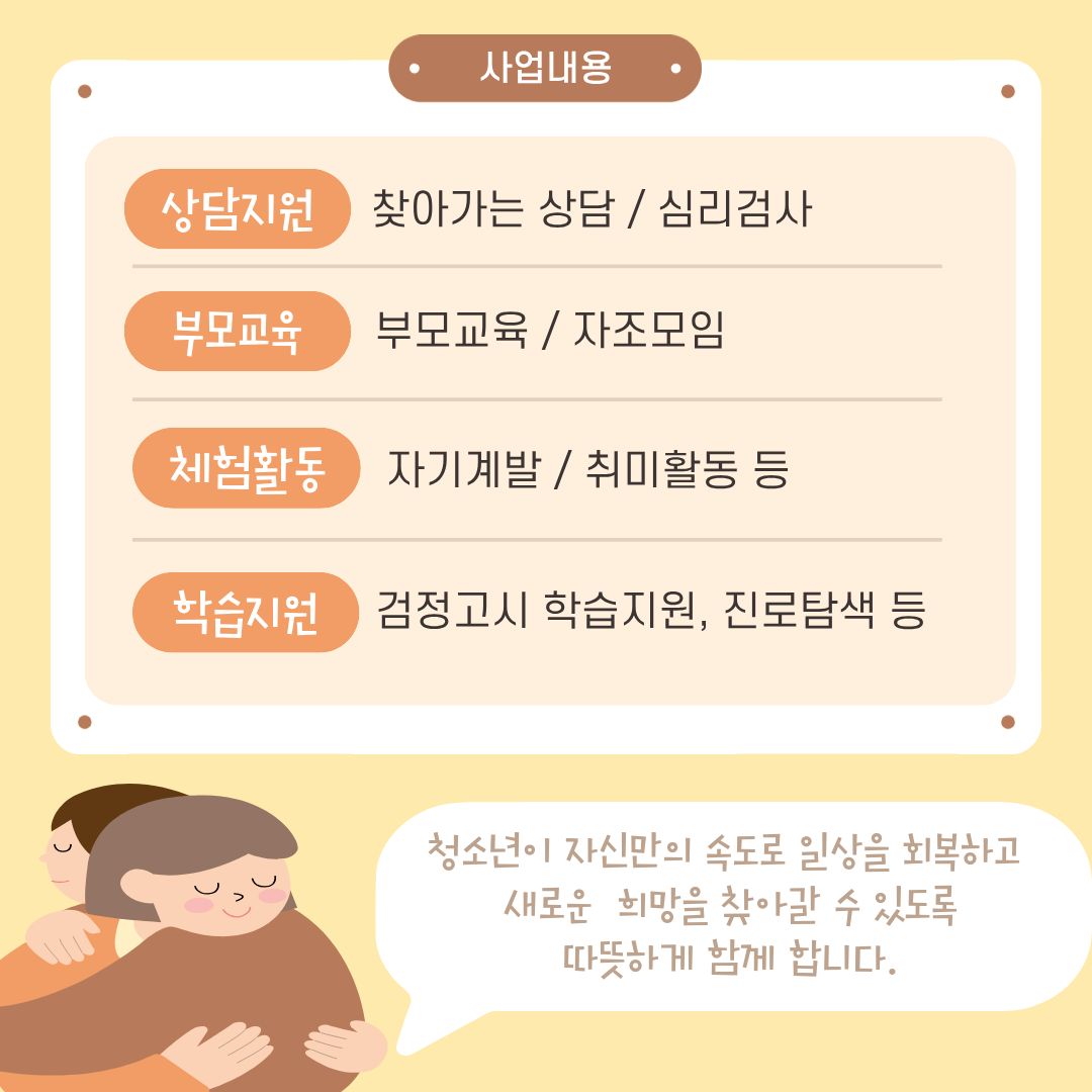 청소년 한 사람 한 사람의 속도에 맞추어 천천히 일상을 회복하고, 새로운 변화를 시작할 수 있도록 함께 하겠습니다.