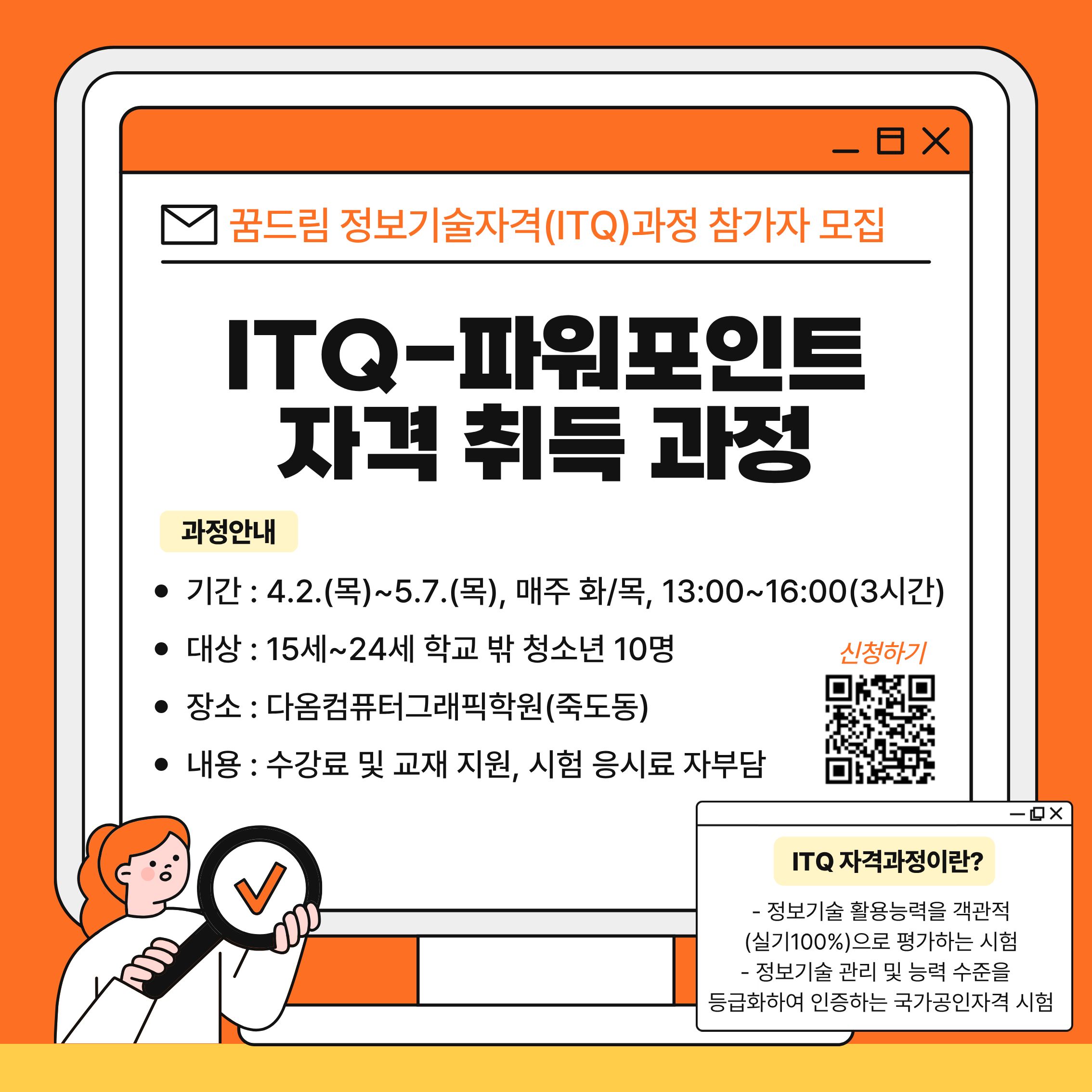 포항시학교밖청소년지원센터에서 'ITQ(정보기술자격)과정-파워포인트' 참가자를 다음과 같이 모집합니다.