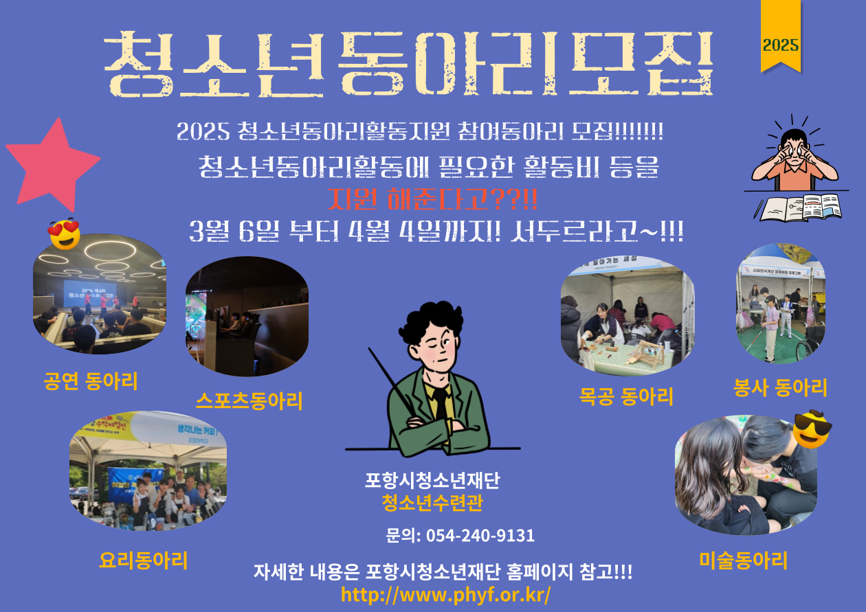 『2025년 청소년동아리활동지원 참여동아리』를 아래와 같이 모집하오니,