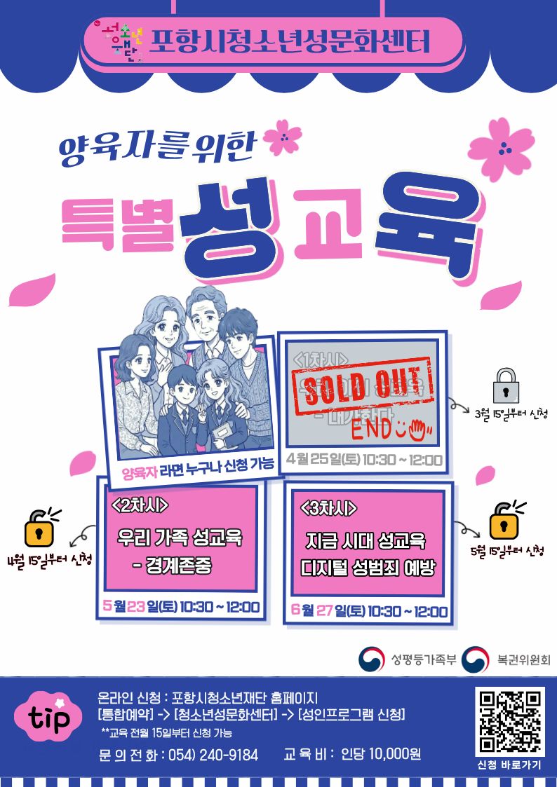 포항시청소년성문화센터에서 가정의 달을 맞아 가정에서 아이와 소통하며 성교육을 실천하고 싶은 양육자분들을 위해 성교육 전문가와 함께하는 특별 성교육 2차시를 준비했습니다! "양육자 라면 누구나" 신청 가능하니 우리 가족의 건강한 성문화를 위해 많은 관심 부탁드립니다