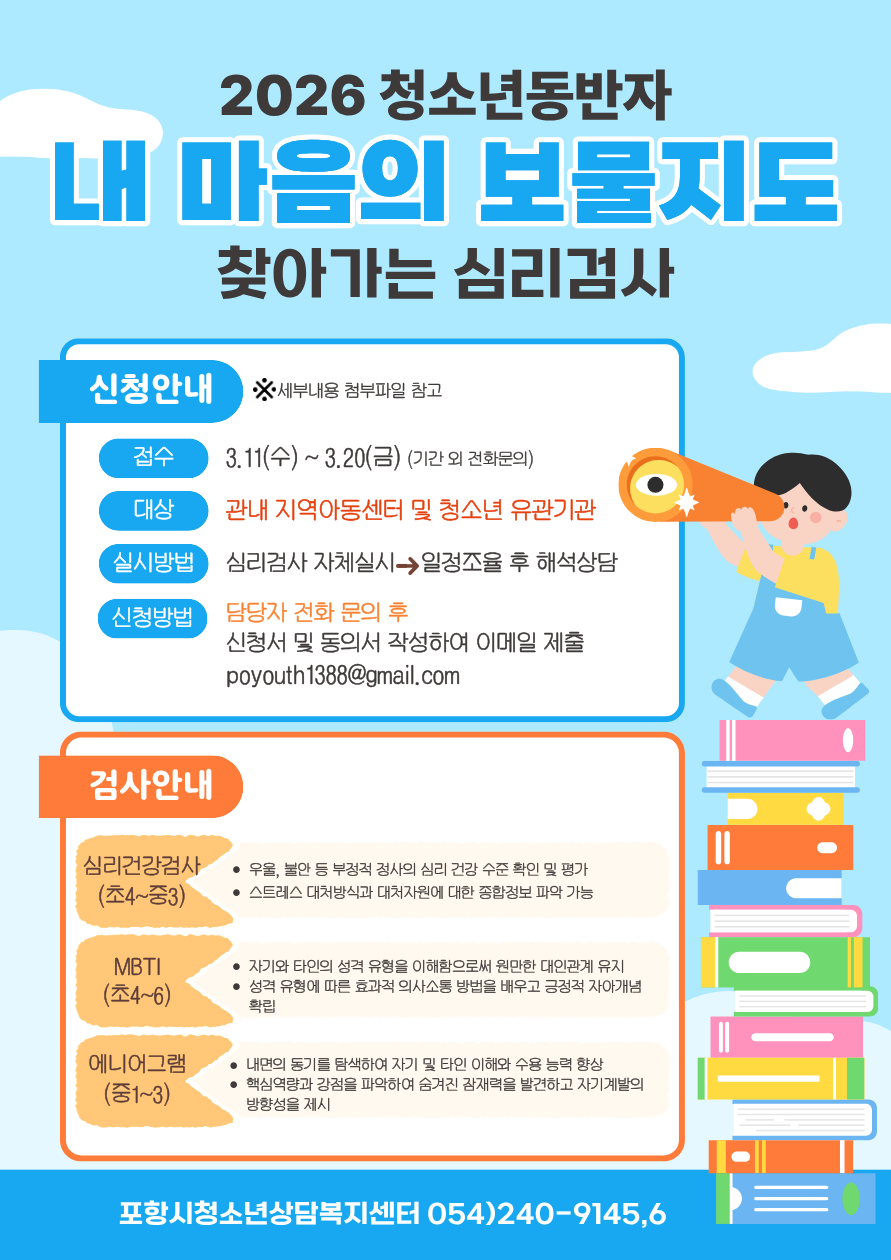 포항시 청소년상담복지센터에서 청소년들이 심리적 어려움을 해소하고 자기 성장 계기를 마련 할 수 있도록 찾아가는 심리검사를 아래와 같이 실시하오니 관심 있는 기관의 많은 신청 바랍니다.