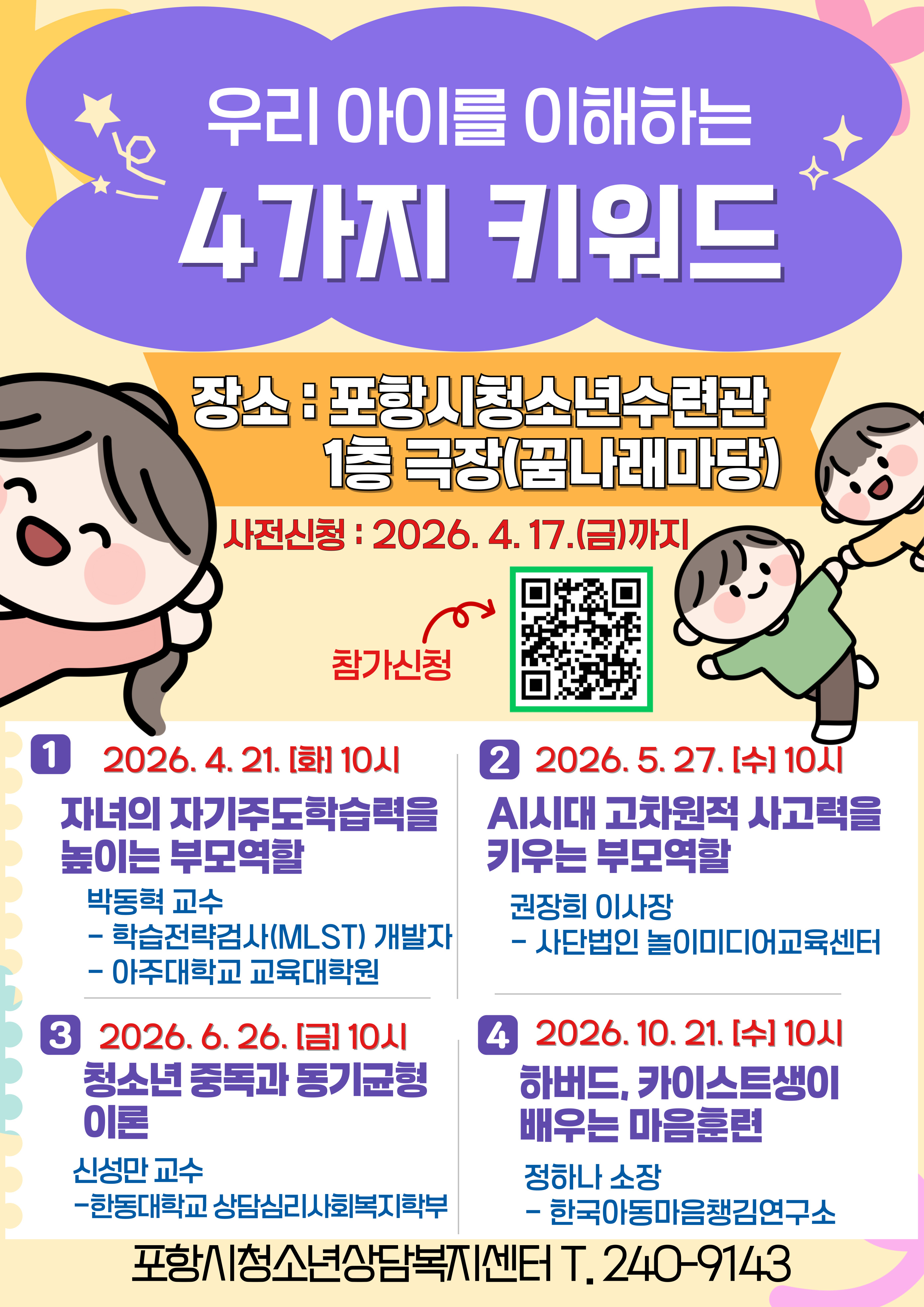 포항시청소년상담복지센터에서는 청소년 자녀를 둔 부모들의 양육역량 강화를 위해 월간부모교육 <우리 아이를 이해하는 4가지 키워드> 를 실시하오니 많은 참여 바랍니다.