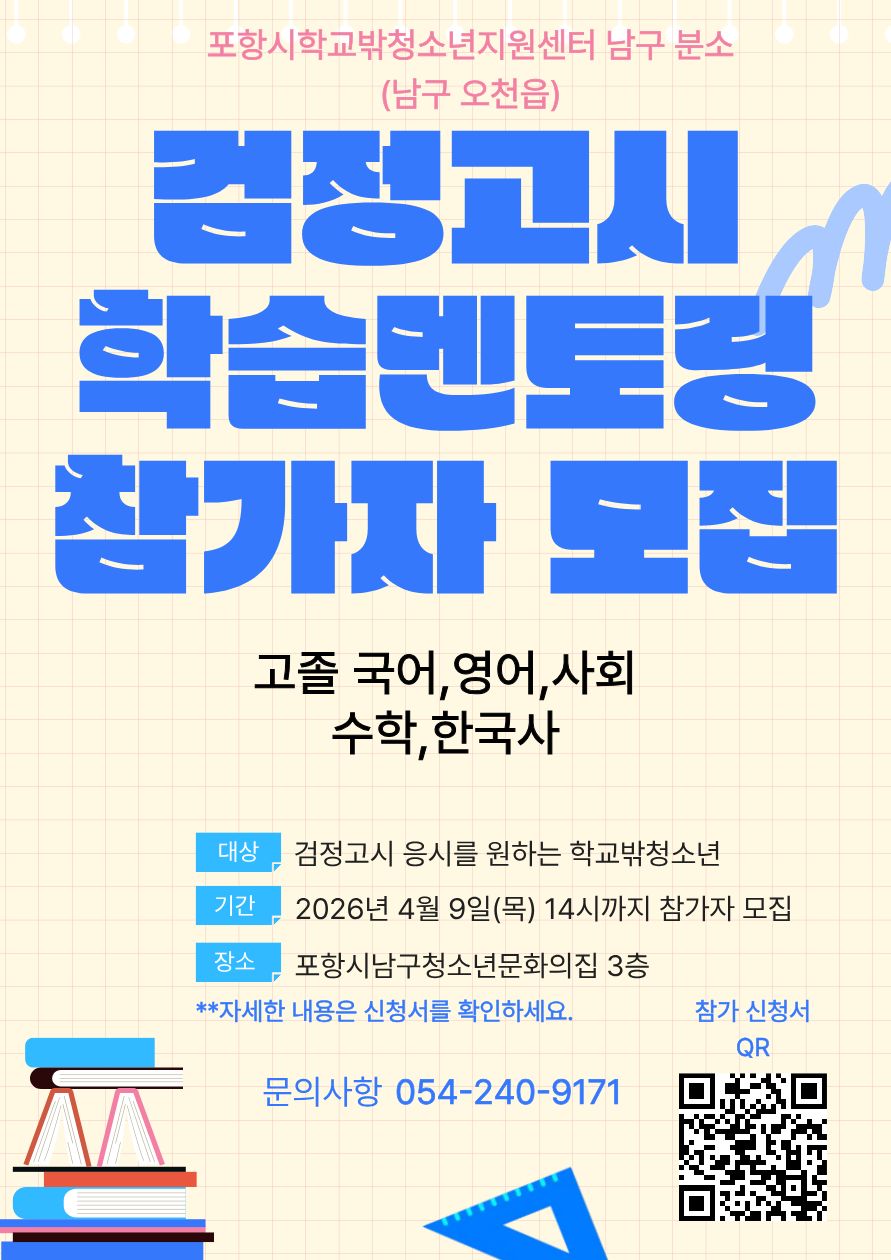 2026년 포항시학교밖청소년지원센터 남구 분소에서 8월 고졸 검정고시를 준비하는 학교 밖 청소년 대상 학습멘토링을 지원하고자 합니다.